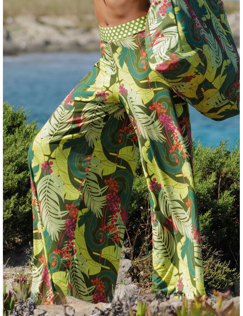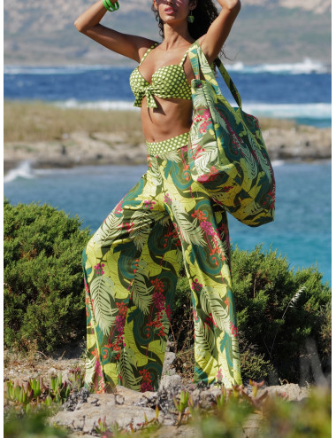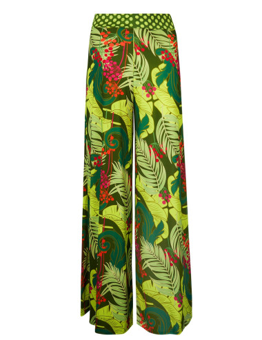 Pantalon avec jambe ample en maille infroissable imprimée végétal avec empiècement à la taille en pois de la collection La Venus nature d'Antigel.