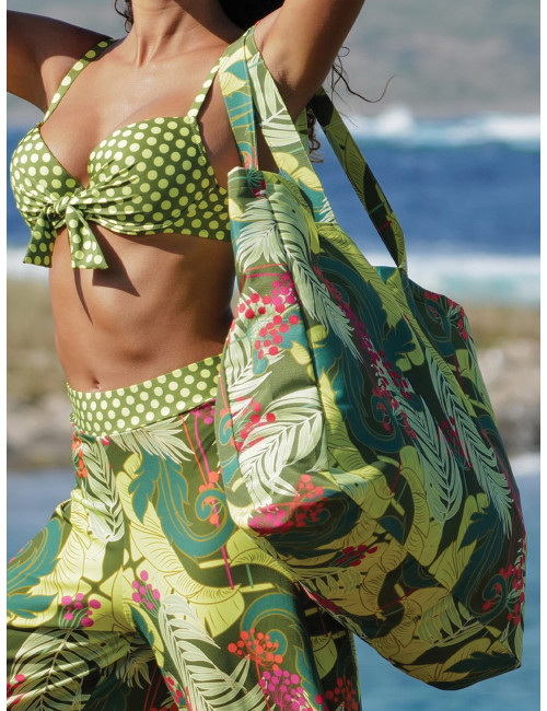 Sac de plage de la collection La Venus nature d'Antigel, en tissu technique imprimé. Dimensions 51*41*11 cm. Longueur anse 60 cm. Logo Antigel.