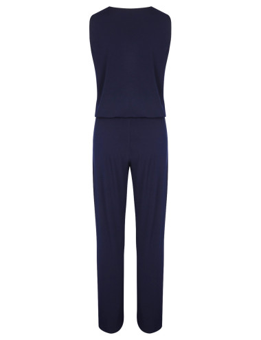 Combi-pantalon en maille opaque fluide, décolleté V plongeant, sans manche de la collection Classe nautique de Lise Charmel. Les poches sont habillées par un joli détail de spaghetti passant dans un bijou doré en forme de U.