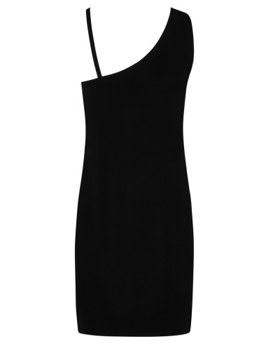 Robe en maille unie à bretelles asymétriques. Une des bretelles est agrémentée d'un bijou doré articulé avec des strass.