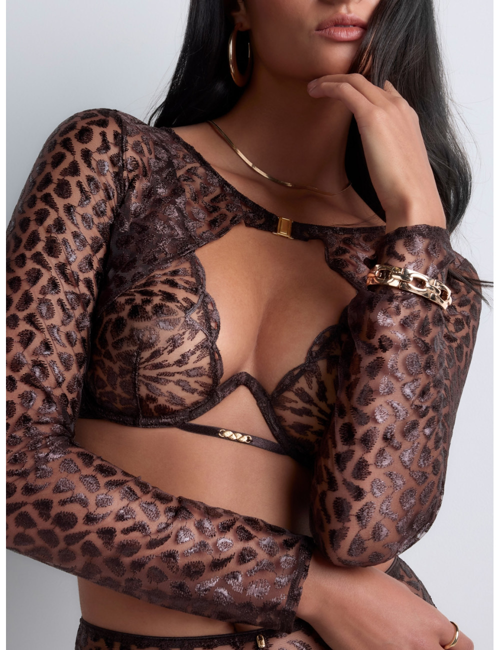 Sublimant la ligne des épaules avec une broderie sexy aux reflets lumineux, le boléro Crazy in Love est une pièce d’exception qui emprunte son élégance et son originalité à l’univers de la haute couture. Manches longues, il s’attache haut sur le buste avec un fermoir doré qui illumine le décolleté.