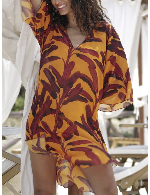 Tunique en voile imprimé, manches à 3/4. Fentes aux cotés. Décolleté V.