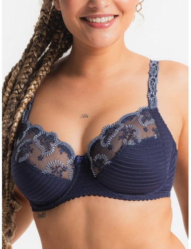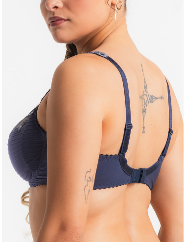 Le soutien-gorge emboîtant Louisa Bracq de la ligne Elise de Louisa Bracq comporte sur le haut des bonnets une broderie de feuilles aux reflets nacrés associée à un tulle transparent.