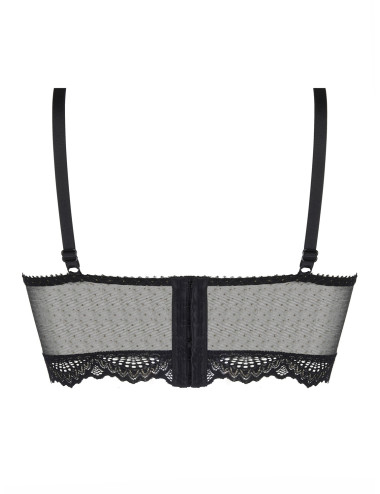 Bustier court de la collection Nuit des étoiles d'Antigel, avec bonnets à coutures verticales. Modèle en tulle pailleté avec incrustation d'une dentelle festonnée sur les décolletés et bas de bustier. Bijou strassé à l'entregorge.