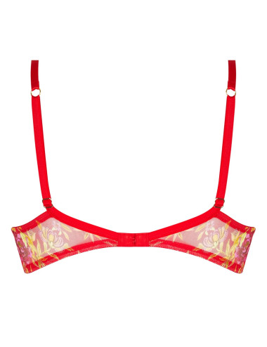 Haut bonnet composé d'un galon brodé multifils festonné, incrusté sur du tulle imprimé et dégarni de la collection Forêt Rubis de Lise Charmel. Le bas bonnet ainsi que la basque sont en tulle imprimé. L'entre gorge plein est agrémenté d'une découpe arrondie au bas et d'un bijou en haut. Les bretelles sont sublimées par des motifs brodés.