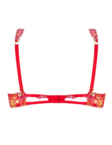 Haut bonnet composé d'un galon brodé multifils festonné, incrusté sur du tulle imprimé et dégarni de la collection Forêt Rubis de Lise Charmel. Le bas bonnet ainsi que la basque sont en tulle imprimé. L'entre gorge est agrémenté d'un bijou coordonné. Le dos fantaisie est orné de deux barettes élastiques sublimées par des motifs brodés.