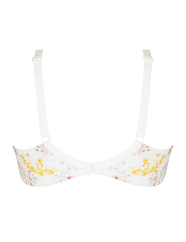 Soutien-gorge souple à armature avec bonnets en trois parties; en maille imprimée très douce de la collection Souffle fleuri d'Antigel. Décolleté bonnet en dentelle incrustée. Bijou papillon à l'entregorge. Départ bretelles devant en spaghettis maille imprimée.