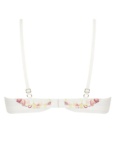 Haut et bas bonnets en broderie multicouleur, basque en tulle élastique avec empiècements brodés aux côtés et milieu dos de la collection Folie d'été de Lise Charmel. Motif 3 strass à l' entre gorge et strass aux bretelles.