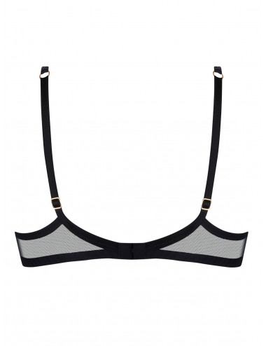 Jeu de superposition de tulles pour un rendu subtil , tamisé en noir et rouge sur les bonnets.Des motifs brodés satin et tulle noir viennent sublimer le décolleté et les bretelles en satin. L'entre-gorge est orné d'un bijou strass rouge et or.