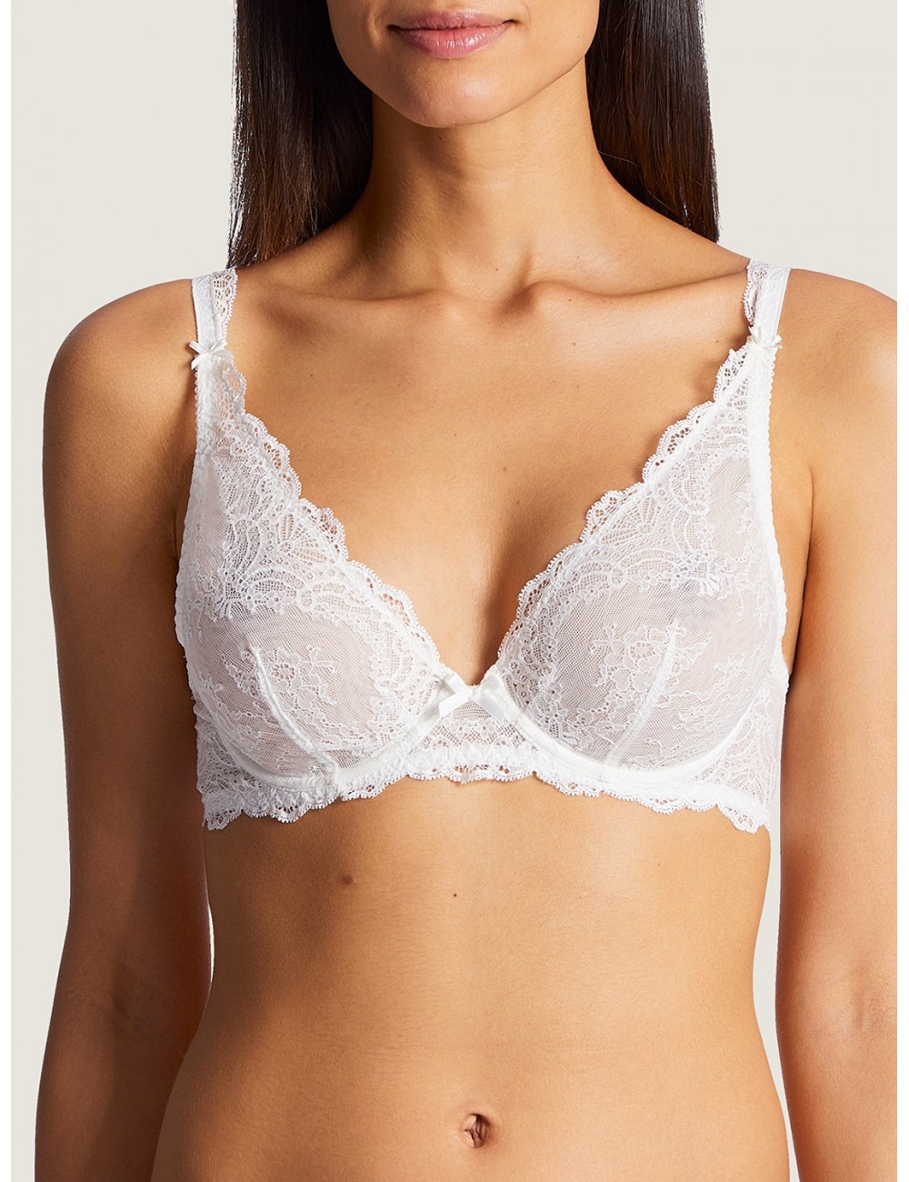 Ce soutien-gorge de la collection Danse des sens d'Aubabde, offre la légèreté du Triangle et le confort des armatures. Les bonnets épousent les seins dans un décolleté plongeant, enrichis d’une sublime écaille de dentelles de la naissance de la poitrine jusqu’aux épaules. Près du cou, deux petits nœuds ajoutent un brin de sensualité à cette pièce tout en confort et séduction.