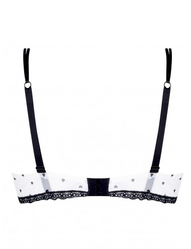 Soutien-gorge souple à armatures tout en tulle imprimé. Galon dentelle noir incrusté sur les décolletés et le bas des basques. Nœud à l'entregorge et sur les bretelles devant.