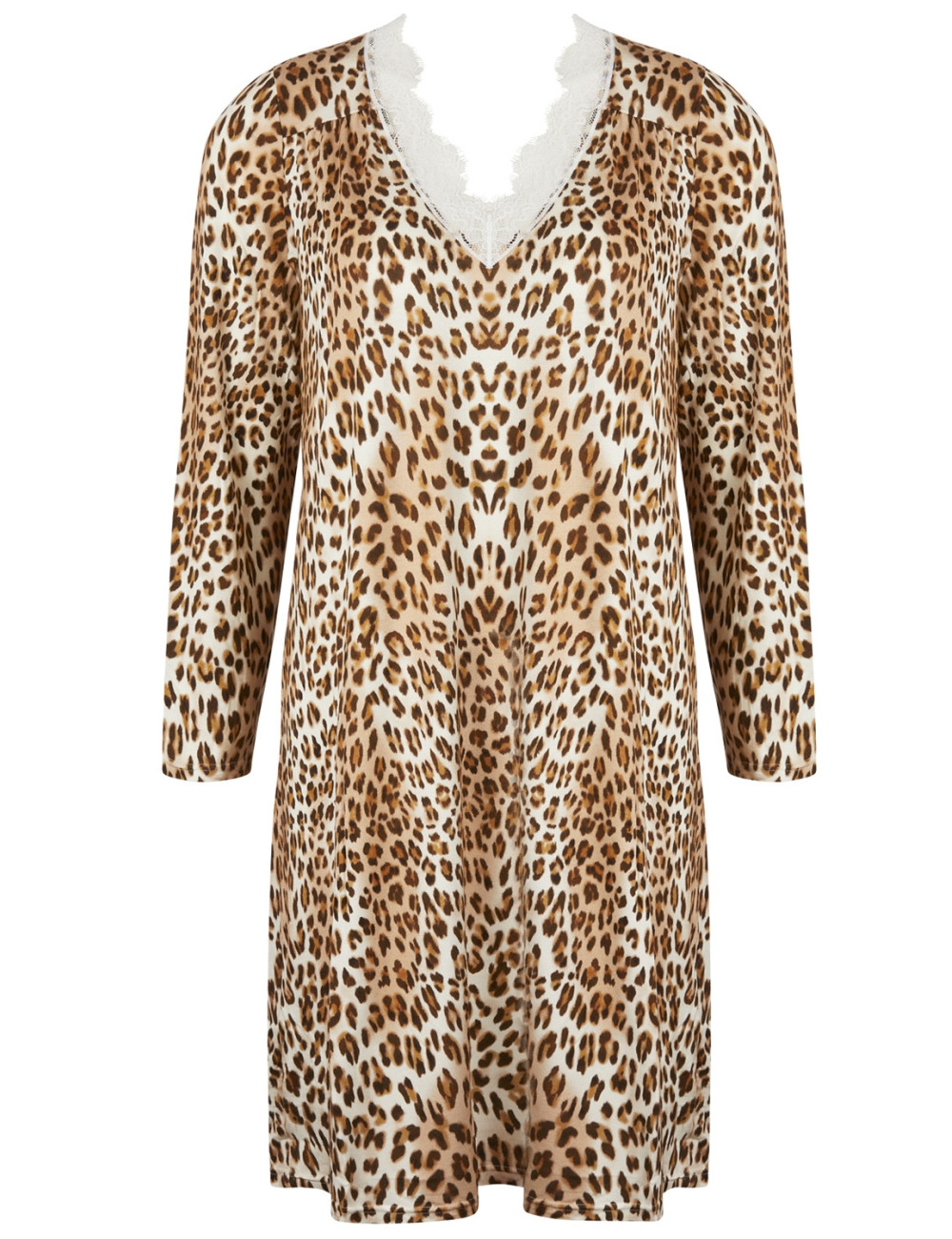 Nuisette manches longues de la collection Panthère Sensuelle tout en maille imprimée avec incrustation dentelle sur le décolleté devant.