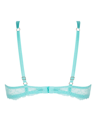 Haut bonnet festonné en broderie et guipure multifils, bas bonnet en laize brodée coordonnée de la collection Princesse iris de Lise Charmel. Basque en dentelle enrichie au centre d'une découpe en tulle, souligné d'un bijou doré strassé. Les bretelles devant s'entrecroisent dans un anneau doré martelé.