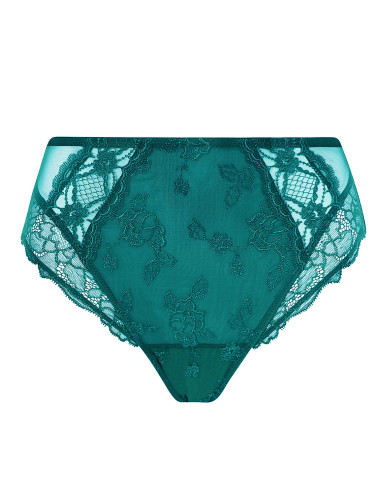Devant en laize et galon brodé , bord cuisse devant en dentelle de Calais leavers, devant doublé pour maintien. Dos en maille recyclée satinée.