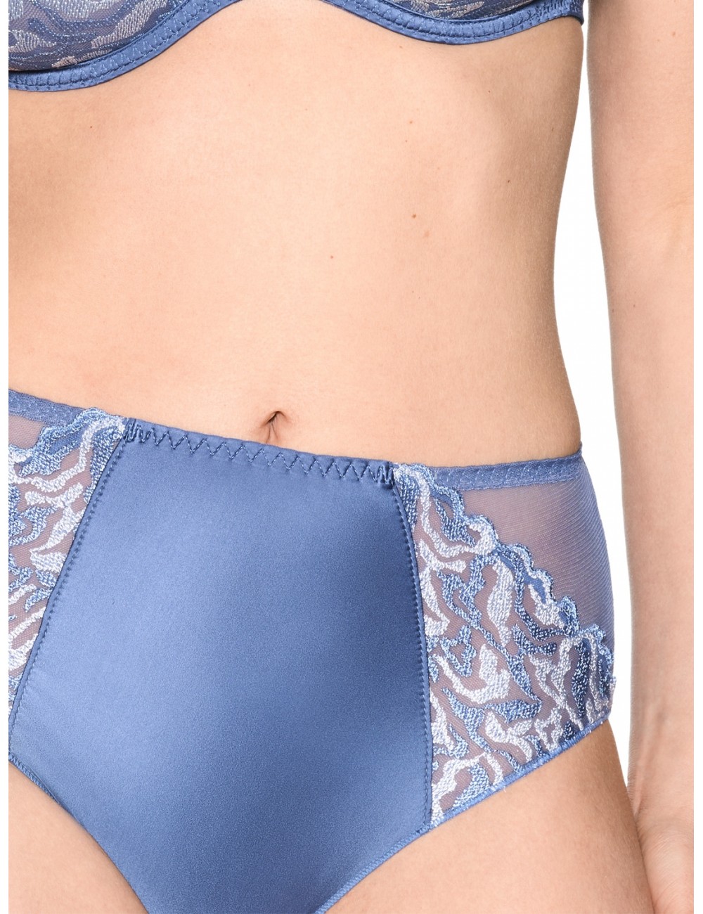 La culotte Louisa Bracq de la ligne Electric Waves comporte sur les côtés du modèle un motif pouvant évoquer des réverbérations lunaires créant ainsi un jeu de transparence tout en séduction avec le tulle brodé scintillant.