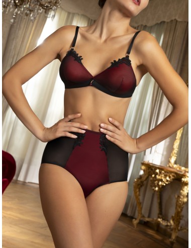 Jeu de superposition de tulles pour un rendu subtil,tamisé en noir et rouge de la collection Bellissime inconnue de Lise Charmel.Deux motifs brodés satin et tulle noir viennent souligner les coutures milieu devant. Les côtés sont semi opaques en tulle gainant. Le haut dos est agrémenté d'un jeu de barettes avec anneaux dorés sur triangle en tulle.