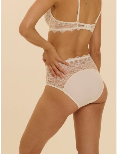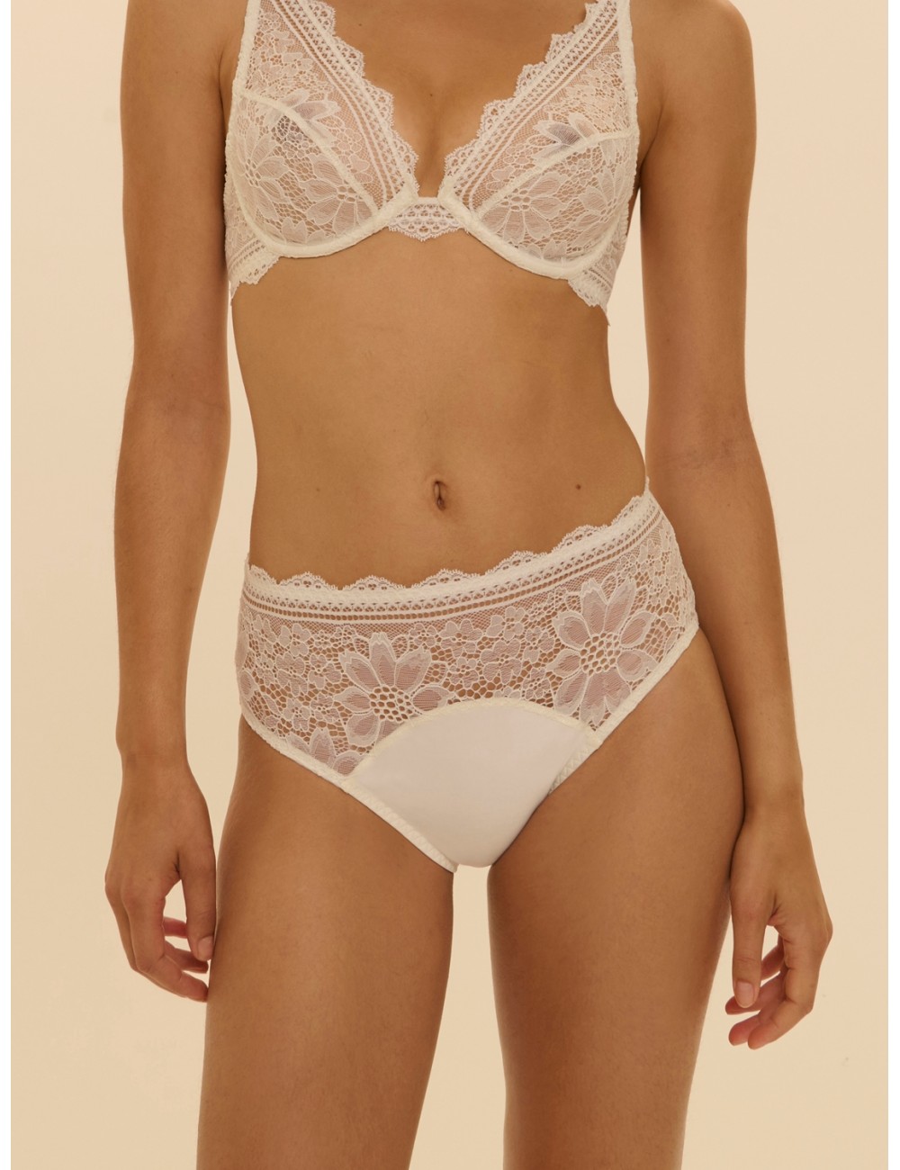 Une dentelle florale rehaussée d'un feston graphique, alliant modernité et élégance de la collection Freesia de Simone Pérèle.