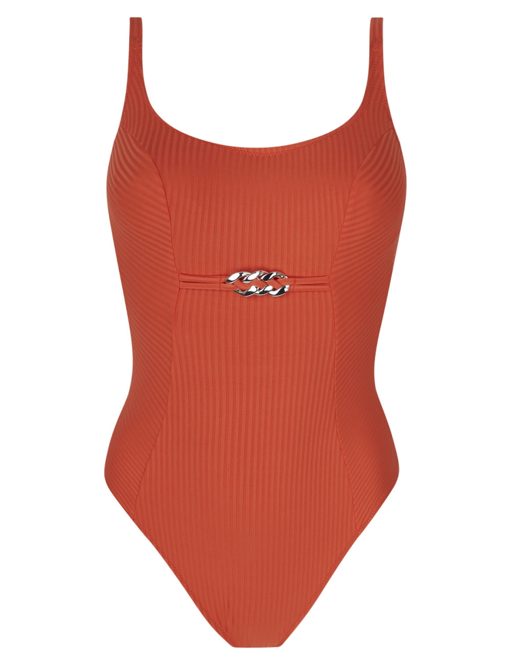 Une pièce effet ventre plat en maille côtelée unie de la collection La Strito Chic d'Antigel. Découpes verticales qui fusèlent la silhouette. Bijou chaine fixé sur spaghettis en dessous poitrine.