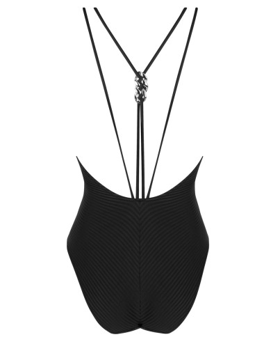 Une pièce décolleté profond devant et dos en maille côtelée unie de la collection La Stricto Chic d'Antigel. Bretelles en double spaghetti. Structuré au dos par des jeux de spaghettis avec accessoire bijou chaine multiposition.
