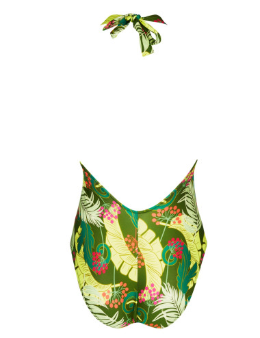 Une pièce décolleté profond devant et dos en maille imprimée végétal, noué tour de cou et au dos de la collection La Venus nature d'Antigel. Bonnets triangles. Bande sous poitrine et noeud entregorge à pois. Mousses amovibles.