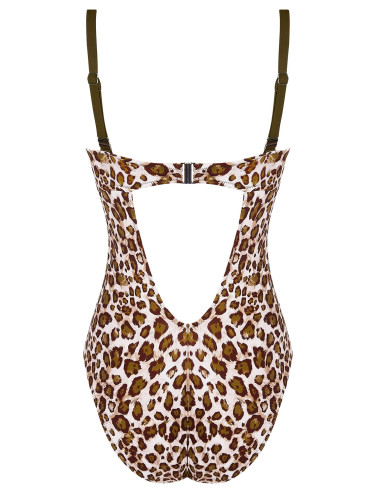 Une pièce décolleté plongeant en maille imprimée de la collection La panthère mystère d'Antigel. Bonnets qui se prolongent pour créer des bandes croisées à l'entre-gorge et fixées aux cotés. Bretelles et empiècements en maille unie en contraste au décolleté.