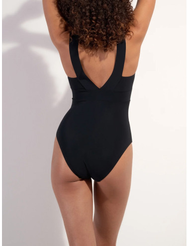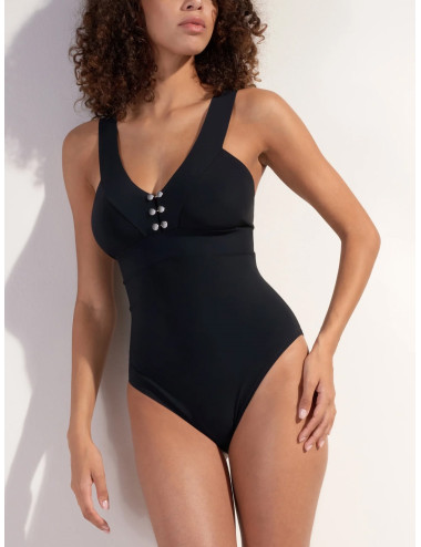 Maillot une pièce nageur Encolure, bretelles et ruban sous-poitrine constitués de larges bandes de bonded, assurant un bon maintien Jeu de 3 boutons de manchettes-barrettes amovibles et réversibles en zamac argenté à l'entre-seins Entièrement doublé