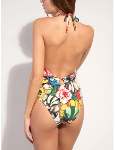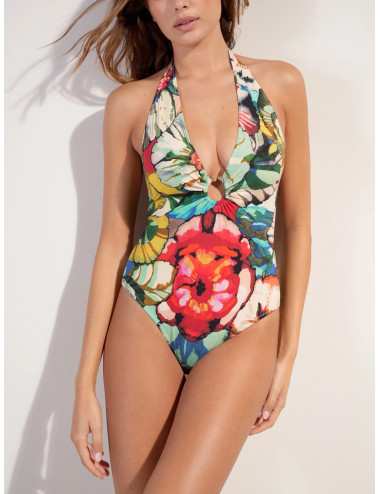 Avec sa coupe échancrée, le maillot de bain LEVEN se pare de profonds décolletés devant et dans le dos qui se drapent élégamment autour d’un bijou en zamac doré. Ce jeu de fronces affine les formes avec distinction. L’imprimé Flower, une nature exubérante où les fleurs aux couleurs chatoyantes incarnent l’esprit Flower Power. Une invitation à embrasser la vie...