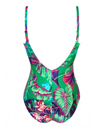 Nageur décolleté V en maille imprimée exotique de la collection Paradis sauvage de Lise Charmel. Dos et devant doublés. Elastique sous poitrine. Bretelles réglables. Départ bretelle agrémenté d'un bijou, double anneaux au coloris, avec une touche dorée entre les deux.