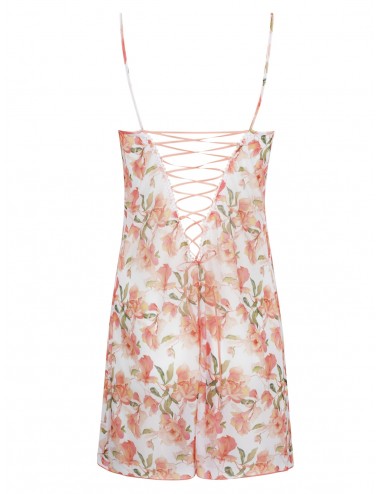 Babydoll tout en tulle imprimé. Grand laçage dos. Bretelles à nouer.