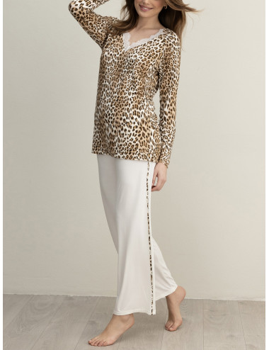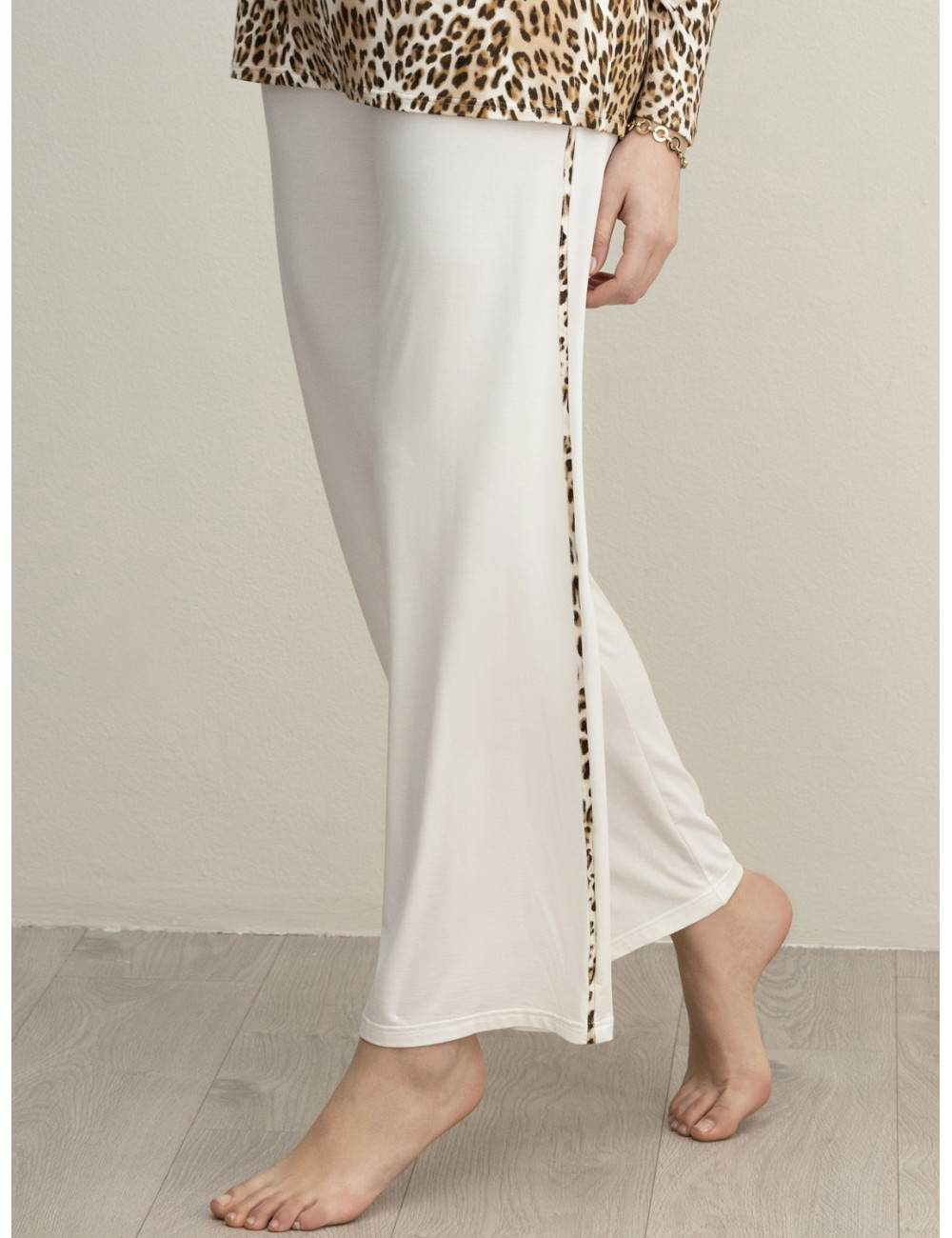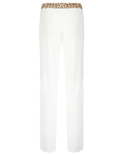 Pantalon en maille unie de la collection Panthère Sensuelle avec empiècement en maille imprimée à la taille. Passepoil sur les côtés des jambes en maille imprimée.