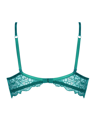 Bonnets en broderie sur tulle sur coque. Basque entière haute en dentelle de Calais leavers. Entre gorge en tulle avec motif strass. Anneaux en métal argenté aux bretelles.