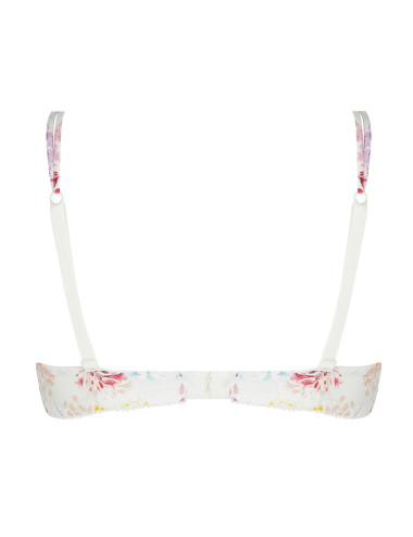 Soutien-gorge à coques avec armature en maille imprimée très douce  de la collection Souffle fleuri d'Antigel. Bijou papillon à l'entregorge. Anneaux dorés sur les spaghettis devant en maille imprimée.