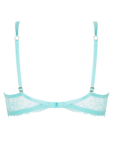Bonnet festonné en broderie et guipure multifils de la collection Princesse iris de Lise Charmel. Basque en dentelle enrichie au centre d'une découpe en tulle, soulignée d'un bijou doré strassé. Les bretelles devant s'entrecroisent dans un anneau doré martelé.