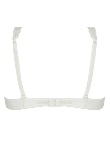 Soutien-gorge 1/2 mousse avec armatures de la collection Je t'aime à la folie d'Antigel. Les bonnets sint en galon brodé festonné incrusté sur tulle. Le décolleté est enrichi d'un petit galon dentelle. Dos en tulle. Le bas de la basque est enrichi d'un petit galon dentelle. Bijou à l'entregorge.