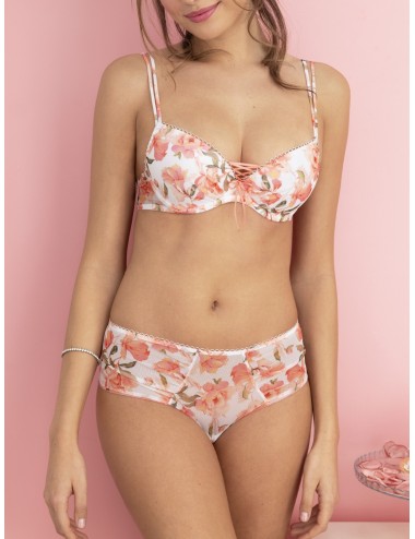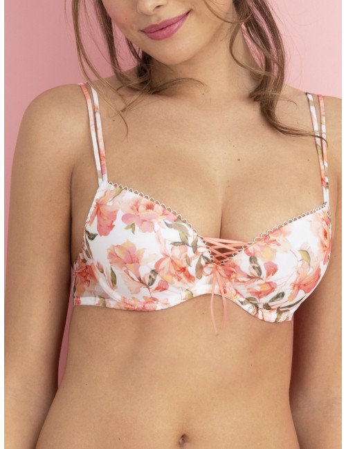 Soutien-gorge coque à armature de la collection Roses gourmandes d'Antigel. Poitrine galbée et arrondie.