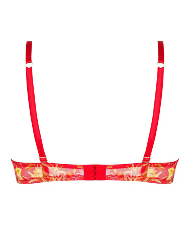 Haut bonnet composé d'un galon brodé multifils festonné, incrusté sur du tulle imprimé et dégarni de la collection Forêt Rubis de Lise Charmel. Le bas bonnet ainsi que la basque sont en tulle imprimé. L'entre gorge est agrémenté d'un bijou coordonné. Les bretelles sont sublimées par des motifs brodés.