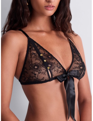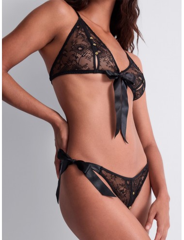 Les boutons dorés précieux ponctuent les bonnets du triangle et le devant de la mini-cœur, des rubans en satin se nouent et se dénouent à l’entre-seins et sur les côtés pour ajuster chaque détail au plus près de votre silhouette. Le triangle épouse naturellement la poitrine pour un rendu souple et sensuel. Proposé en taille unique ajustable, Lace Insomnia s’adapte aux courbes et invite à explorer tous les jeux de séduction.