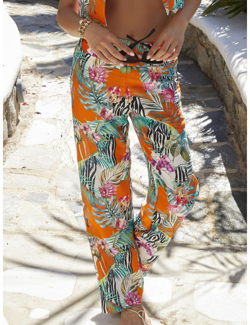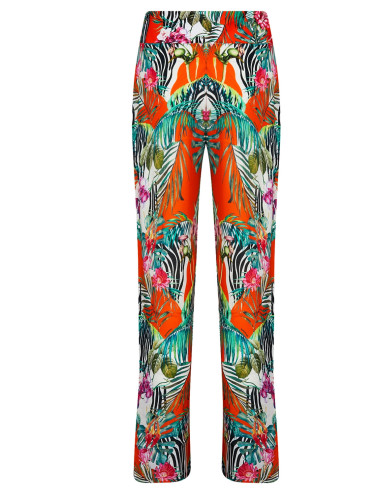 Pantalon imprimé dont les jambes sont en tissu et la taille, en maille de la collection Echappée Libre de Lise Charmel.
