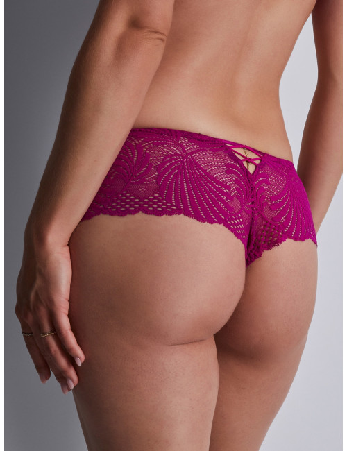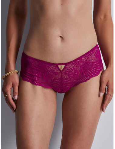 Large sur les hanches pour un effet affiné confortable, le shorty Rhythm of Desire déploie sa dentelle végétale élégante, surmontée par un bijou doré. Derrière, il offre une forme échancrée qui met en valeur le galbe des fesses et dévoile subtilement le creux des reins pour une silhouette résolument moderne.