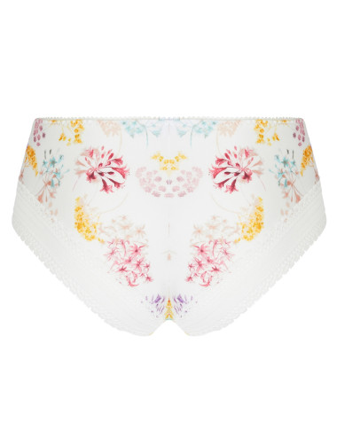Shorty en maille imprimée avec incrustation de dentelle sur cotés devant et dos de la collection Souffle fleuri d'Antigel. Un élastique fantaisie souligne la taille.