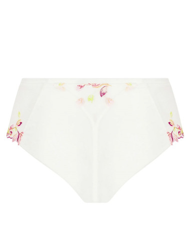 Broderie festonnée multicouleur sur tulle sur les côtés et laize brodée au milieu devant de la collection Folie d'été de Lise Charmel. Tulle élastique plié en 2 sur les cuisses dos et triangle de laize, avec bande tulle à la taille. Motif brodé multicouleur appliqué sur le côté devant gauche.