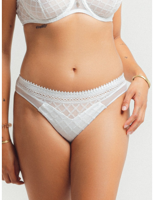 Le slip Louisa Bracq de la ligne Paco sublime les courbes et offre un visuel captivant grâce à sa broderie géométrique.