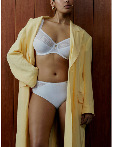 Intrigue est une ligne de Chantelle qui associe broderie au motif pied de poule à une maille subtilement texturée.