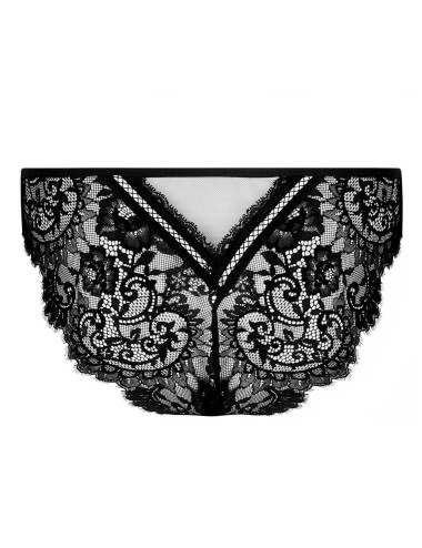 Slip en dentelle festonnée aux cuisses devant et dos de la collection Désirs de Venise de Lise Charmel. Le devant offre un jeu de transparence grâce à un empiècement de tulle souligné par un raffiné jour échelle orné d'un fin galon de dentelle. Au dos, une découpe triangulaire structure la silhouette avec finesse, reprenant les mêmes finitions.