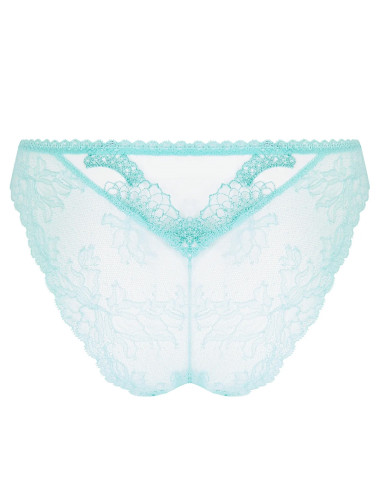 Slip en tulle, broderies et dentelle festonnée en cuisses devant et dos. Haut devant en tulle cristal entouré de broderie festonnée en V, bas devant en laize coordonnée. Dos dentelle structuré par un triangle de broderie festonnée et de tulle cristal au coeur de la taille milieu dos. Petit galon dentelle à la taille.