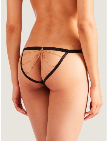 Esprit glam rock assuré avec ses bandes satinées élastiquées et ses chainettes dorées au dos dévoilant les fesses telle un rideau érotique.