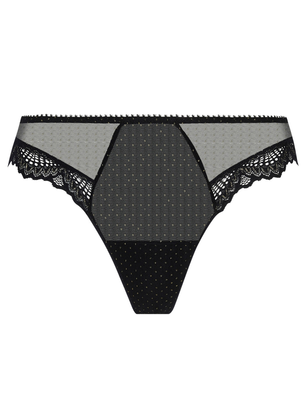 Tanga de la collection Nuit des étoiles d'Antigel, en tulle pailleté avec incrustation d'un galon de dentelle sur les cuisses devant et dos. Un picot élastique festonné souligne la taille.