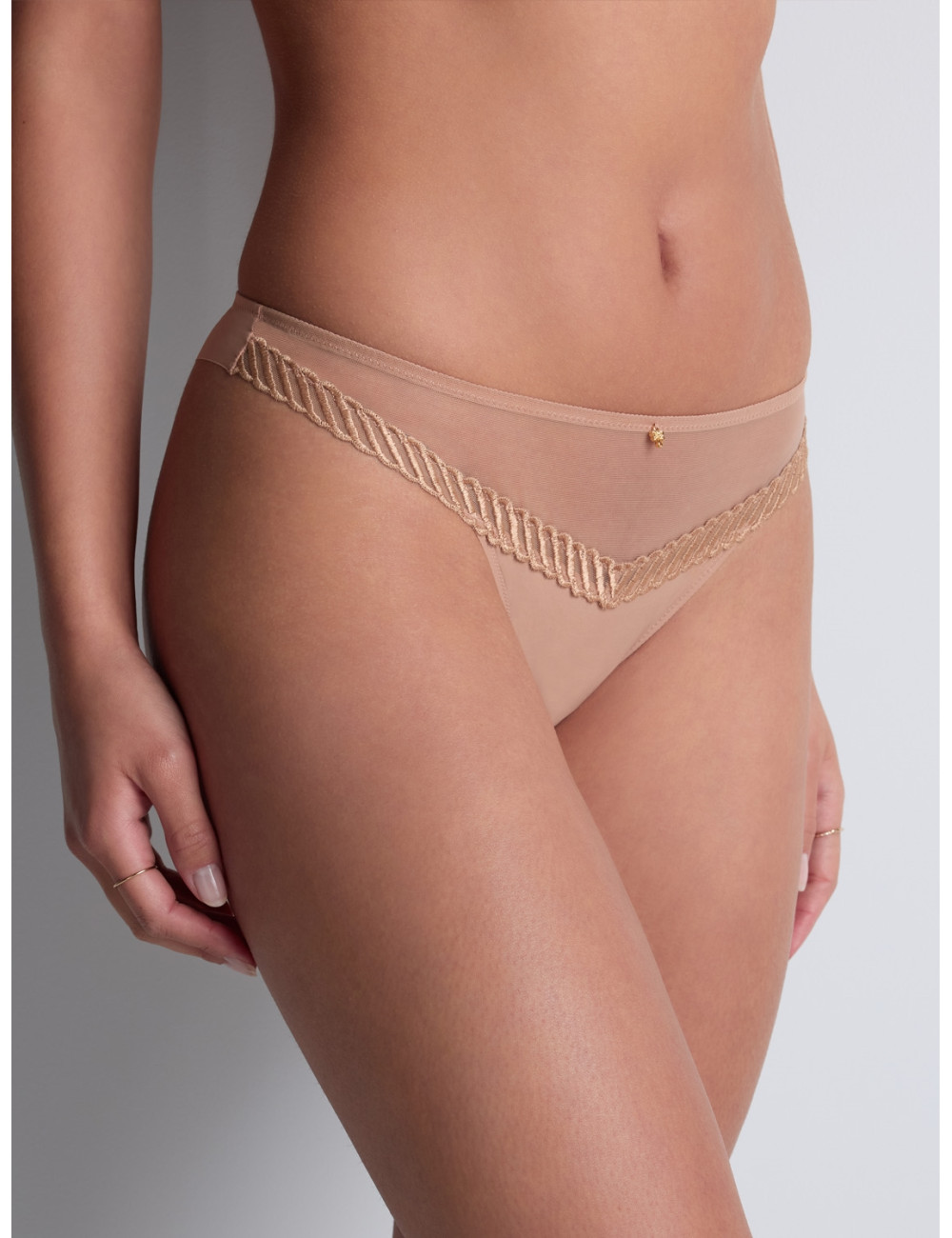 Sexy, le tanga Sheer Emotion se pare devant d’un empiècement en tulle transparent très séduisant, souligné par une bande brodée graphique contemporaine et par un bijou doré qui illumine la taille. Dans le dos, il est entièrement composé d’une maille douce et confortable qui le rend invisible sous les vêtements.