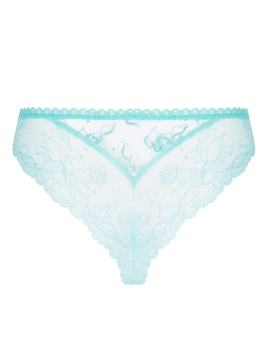 String en tulle, broderies et dentelle festonnée, aux cuisses devant et dos de la collection Princesse iris de Lise Charmel. Haut devant en tulle cristal entouré de broderie festonnée en V, bas devant en laize coordonnée. Dos dentelle structuré par un triangle de laize brodé à la taille milieu dos. Petit galon dentelle à la taille.
