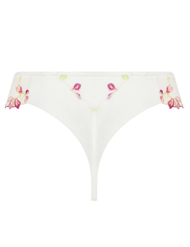 Broderie festonnée multicouleur sur tulle sur les côtés du string et laize brodée au milieu devant de la collection Folie d'été de Lise Charmel. Tulle élastique plié en 2 sur les cuisses dos et triangle de laize, avec bande tulle à la taille.
